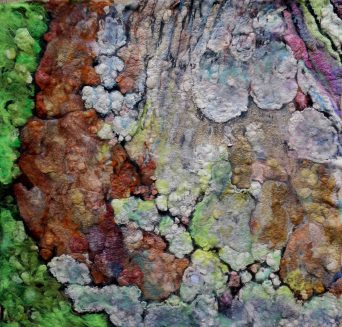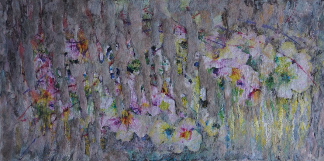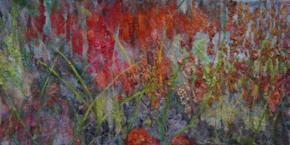 - Alpine Meadow. 100X150 cm. Hand dyed silk on painted canvas.