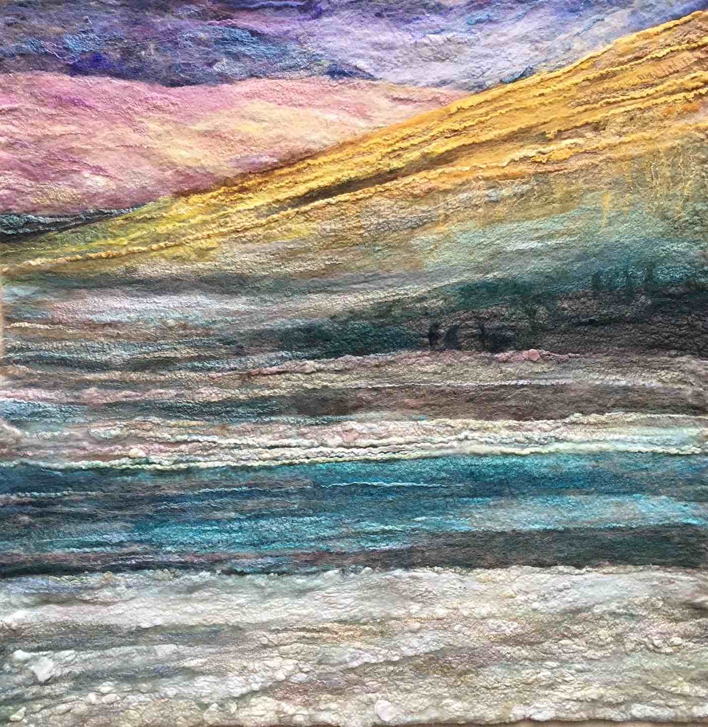 - The Lake. 60 X 150 cm. Felted hand dyed wool and silk on painted canvas.